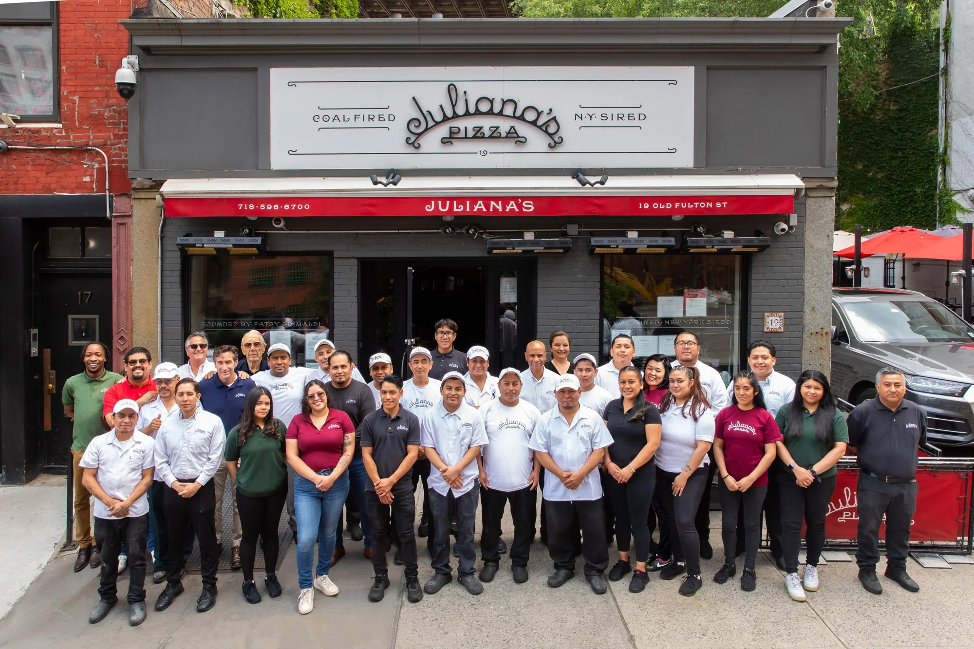 Juliana’s heralds the return of Patsy Grimaldi, NYC’s most celebrated pizza proprietor, to 19 Old Fulton Street, the original location under the Brooklyn Bridge where he and his wife, Carol, founded legendary Grimaldi’s Pizzeria. Unbeknownst to many, Pat and Carol sold Grimaldi’s and retired almost two decades ago. In 2012, they “unretired” to partner with their close friend to establish Juliana’s, proudly preparing and serving pies the way Patsy has for generations: deliciously thin crusts hosting only the finest housemade, locally and internationally-sourced toppings, expertly turned inside the original hand-built coal-fired oven—the first commissioned in New York in over fifty years.